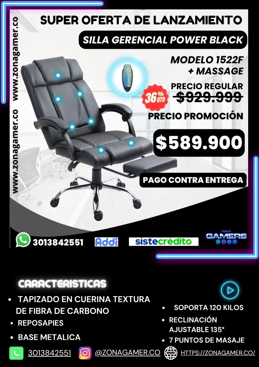 Nuestra Silla Gerencial Power Black 1522F + Massage es un artículo exclusivo de Zona Gamer. Entendemos que cada cliente tiene sus necesidades, por eso ofrecemos múltiples métodos de pago, como Addi, Sistécrédito, débito y contraentrega. Hacemos que el proceso de compra sea lo más sencillo y cómodo posible, permitiéndote obtener este producto excepcional de la forma que mejor se adapte a ti.