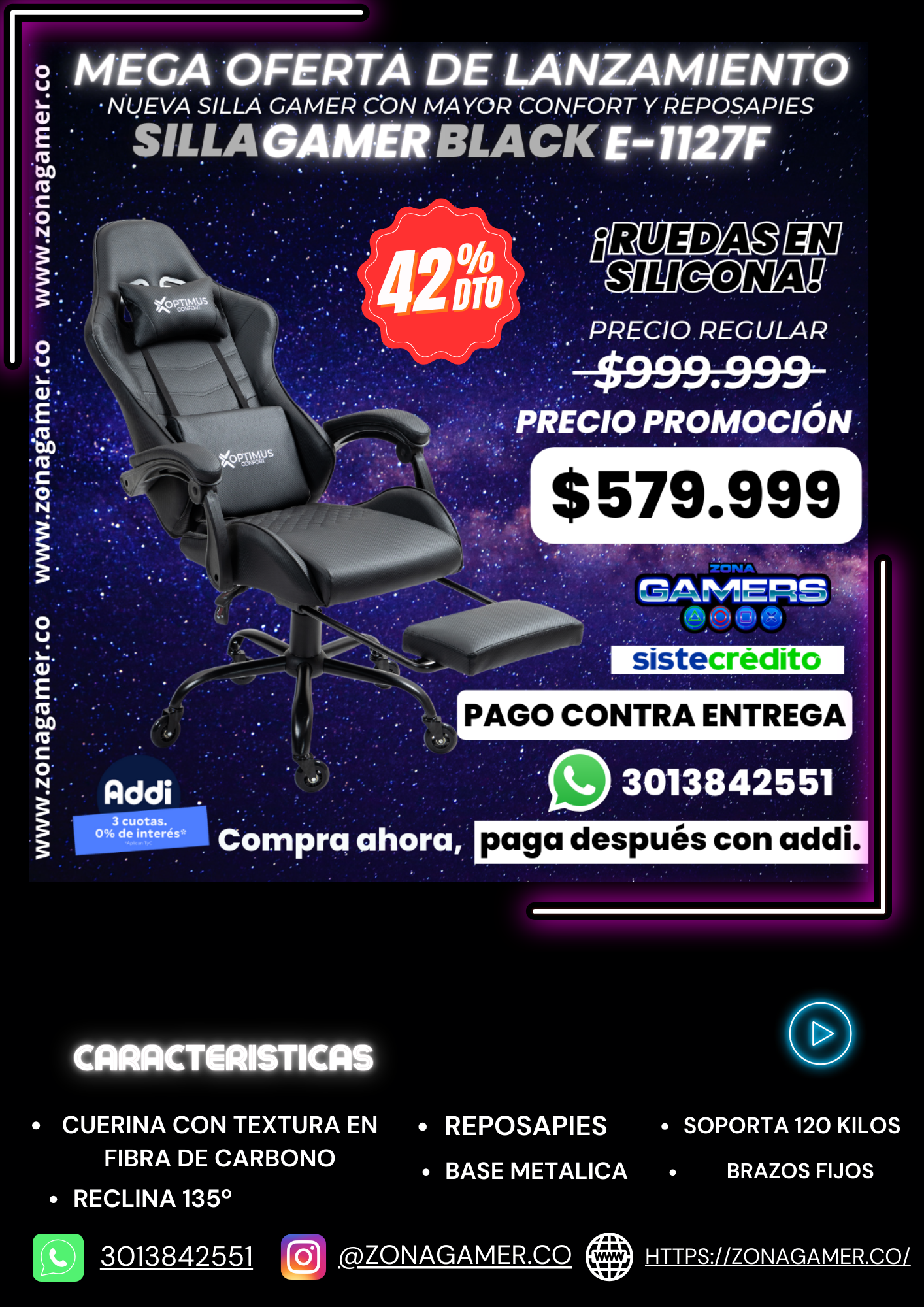 Si estás buscando la combinación perfecta de estilo, confort y funcionalidad, la Silla Gamer E-1127F Black con reposapiés y ruedas en silicona es tu mejor opción. Este producto exclusivo de Zona Gamer se puede adquirir mediante diferentes opciones de pago para tu comodidad, incluyendo Addi, Sistécrédito, pago con débito y contraentrega. No dejes pasar la oportunidad de elevar tu experiencia de juego con esta silla gamer de calidad superior, diseñada especialmente para gamers exigentes como tú.
