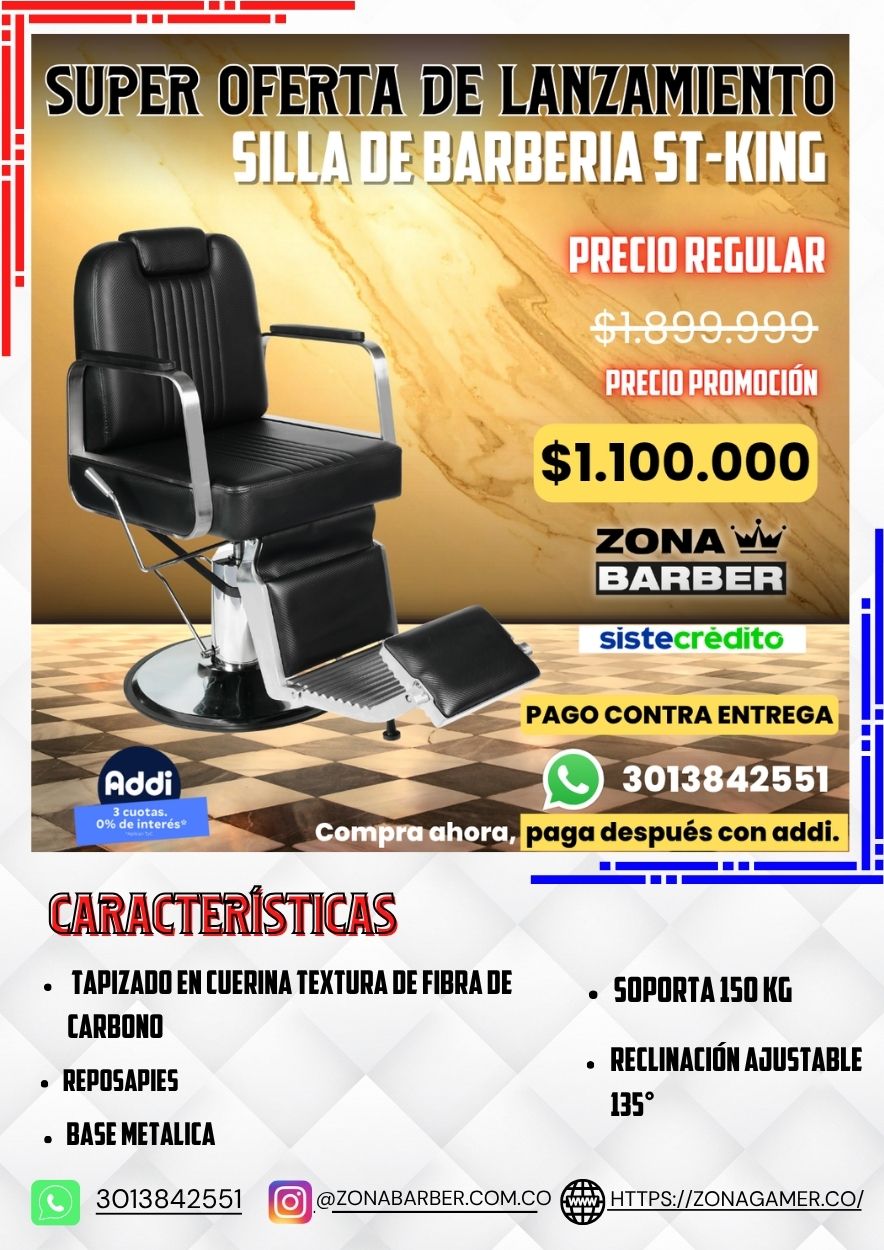 La Silla de Barbería ST-King es un producto exclusivo de Zona Gamer. Ofrecemos una amplia gama de métodos de pago, incluyendo Addi, Sistécrédito, débito y contraentrega, facilitando la compra y adaptándose a tus necesidades.